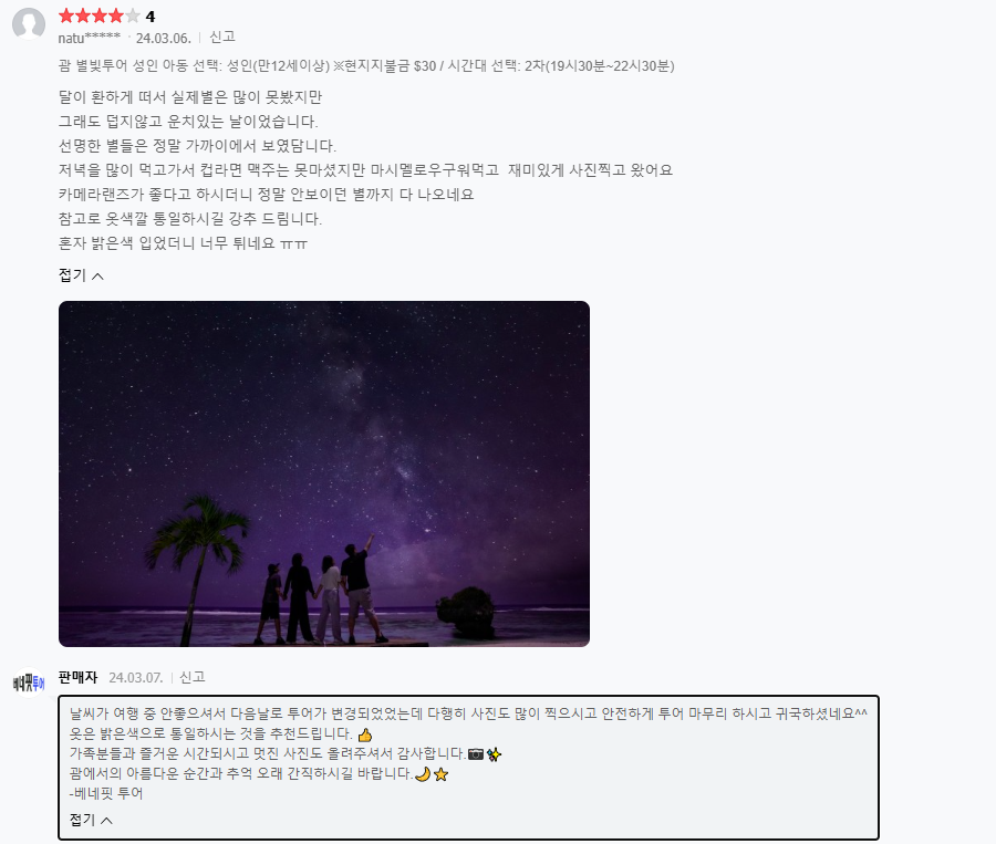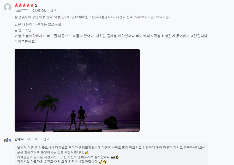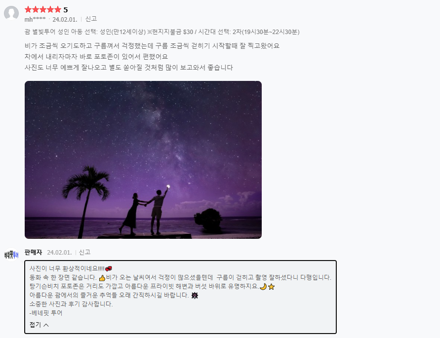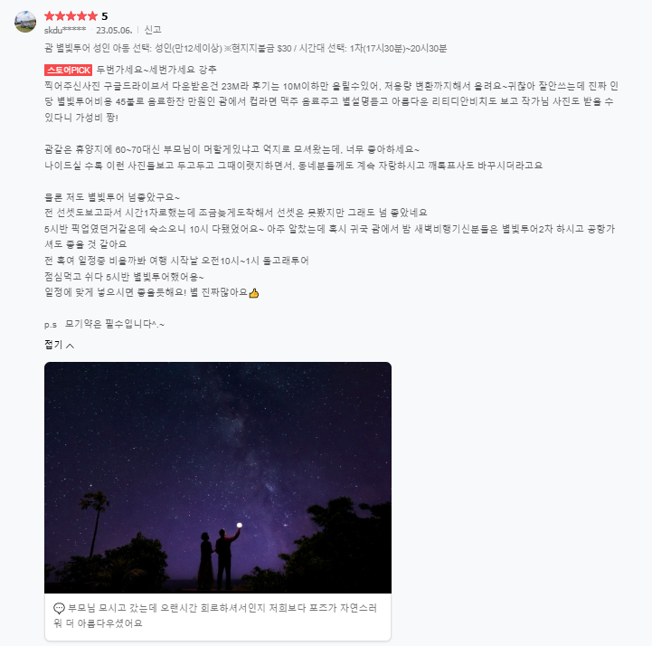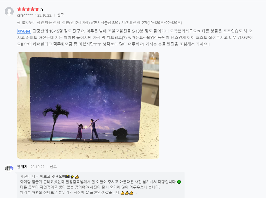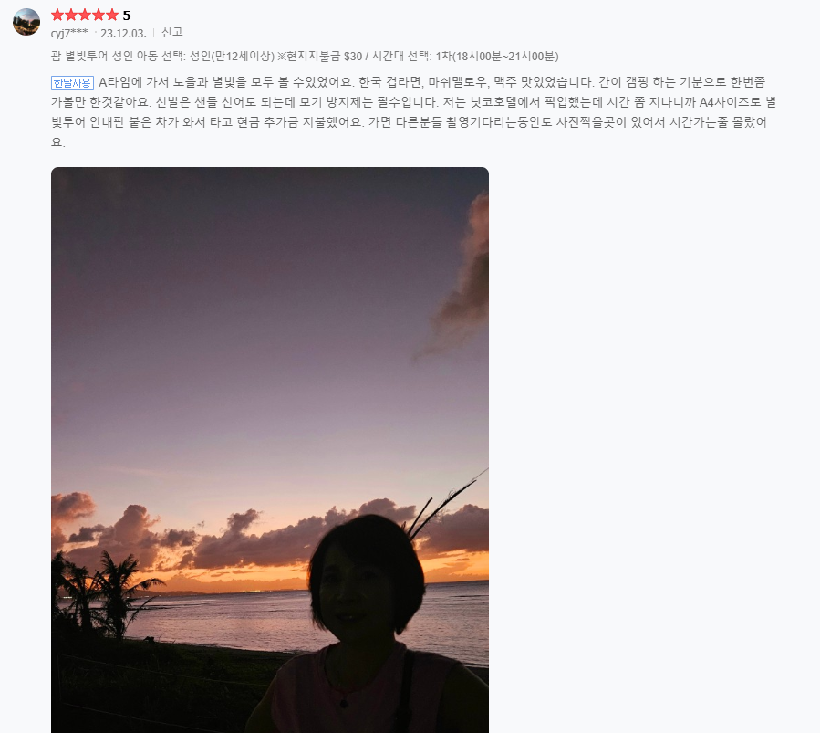 2차 예약 시 선셋이 진 후라 선셋은 볼수 없지만 더 어두운 밤하늘에 반짝이는 별들을 더 선명하게 볼수 있습니다.