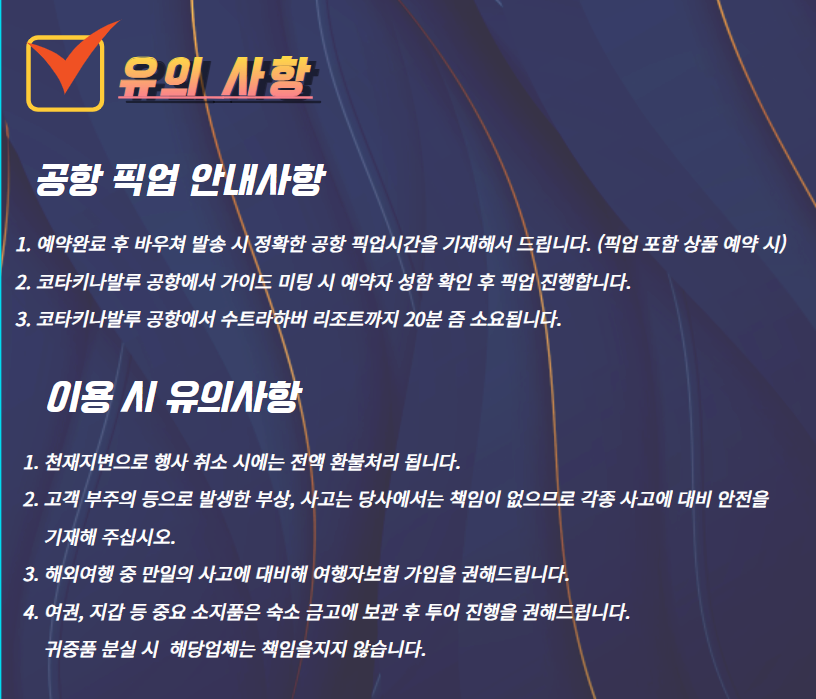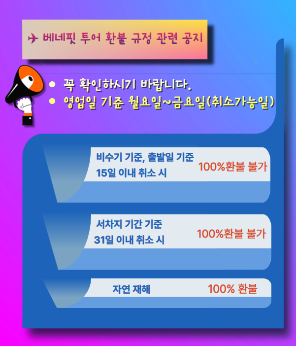 * 본 상품은 구매 시 예약 확정되지 않으며, 여행사의 해피콜 후 예약이 확정됩니다. (예약확정 전에는 여행사 사정에 의해 환불 될 수 있습니다.)