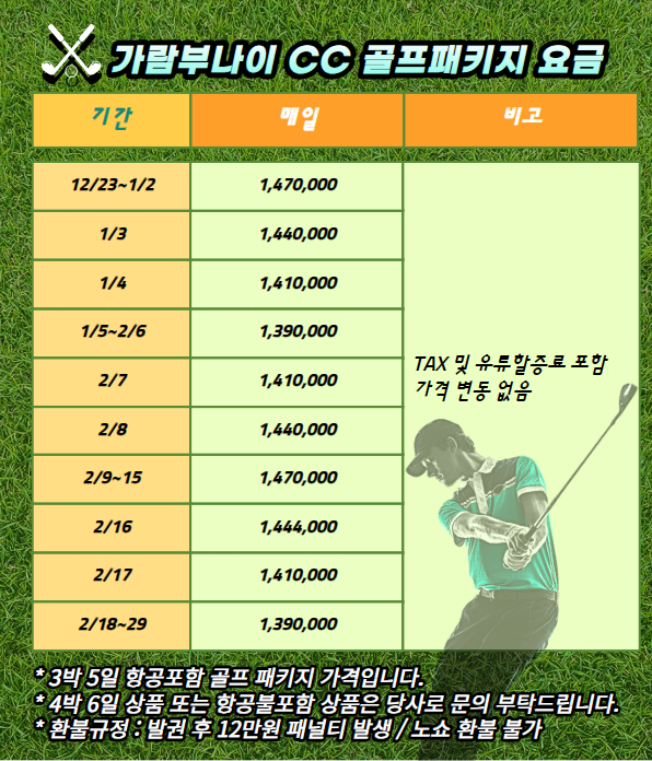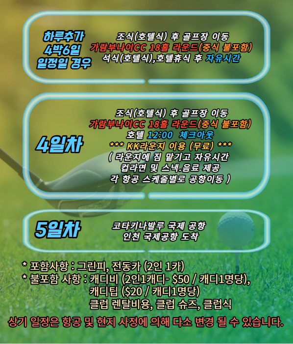 가람부나이CC 골프비용(3박~18홀x3회,4박~18홀x4회 라운드) /그린피,전동카(2인1카)