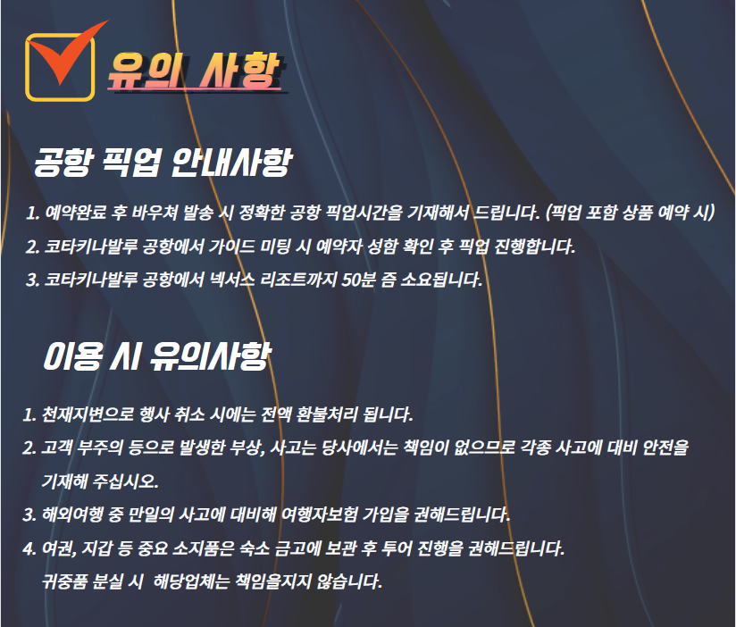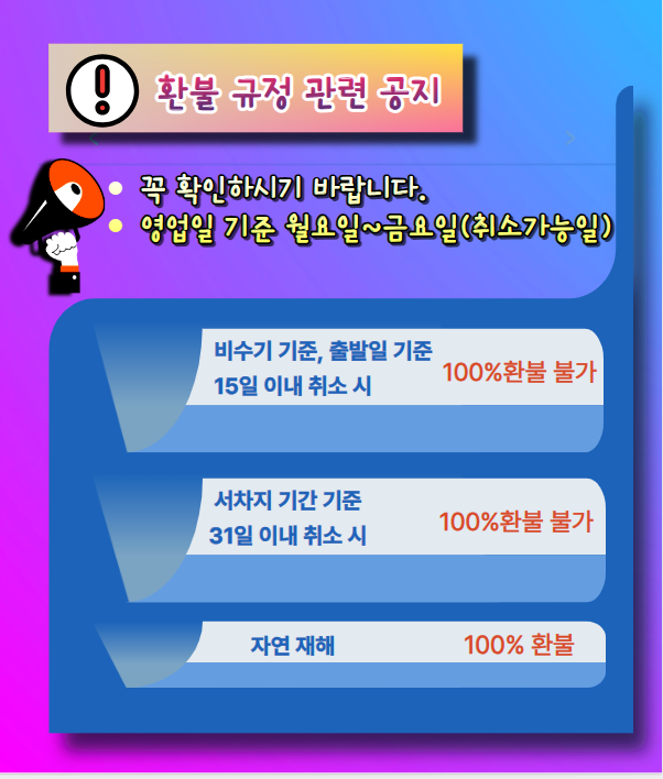 * 본 상품은 구매 시 예약 확정되지 않으며, 여행사의 해피콜 후 예약이 확정됩니다. (예약확정 전에는 여행사 사정에 의해 환불 될 수 있습니다.)