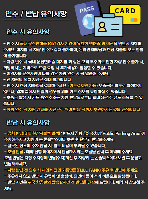 - 예약 조건 : 24시간 이상 예약 필수, 만 21세 이상의 국내 운전면허증 취득자