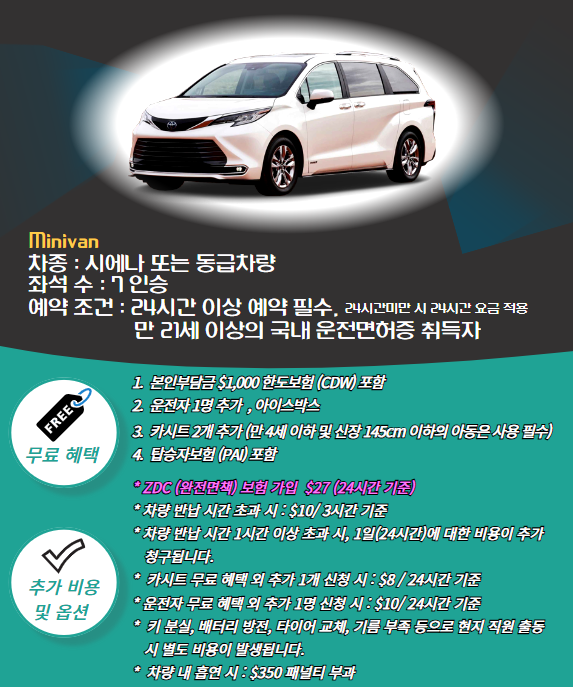 - 차종 : 시에나 또는 동급차량(미니밴)