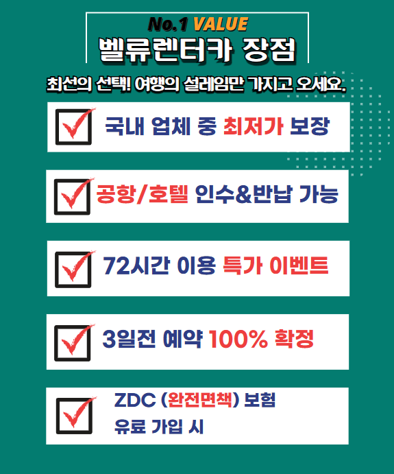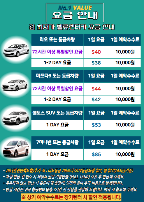 - 예약 조건 : 24시간 이상 예약 필수, 만 21세 이상의 국내 운전면허증 취득자