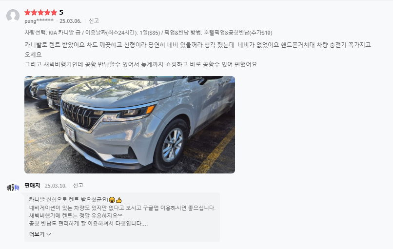 - 차량 반납 시간 초과 시 : $10 / 3시간 기준