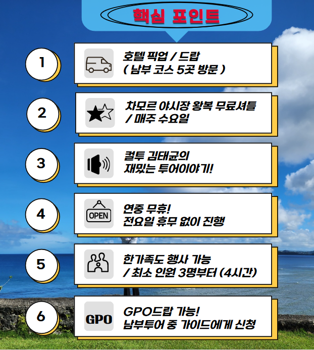 남부투어 4시간 소요 (미리 식사 및 간식 지참 필요)