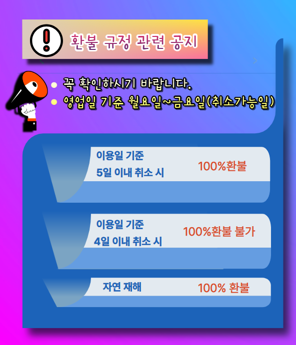 천재지변으로 인한 일정 변경 및 시간 단축으로 인한 부분환불은 안됩니다.