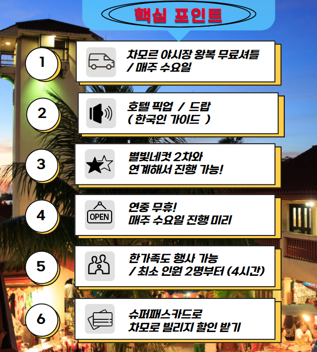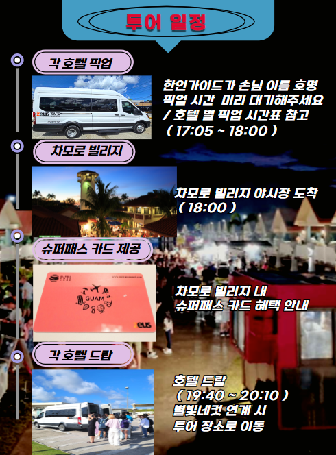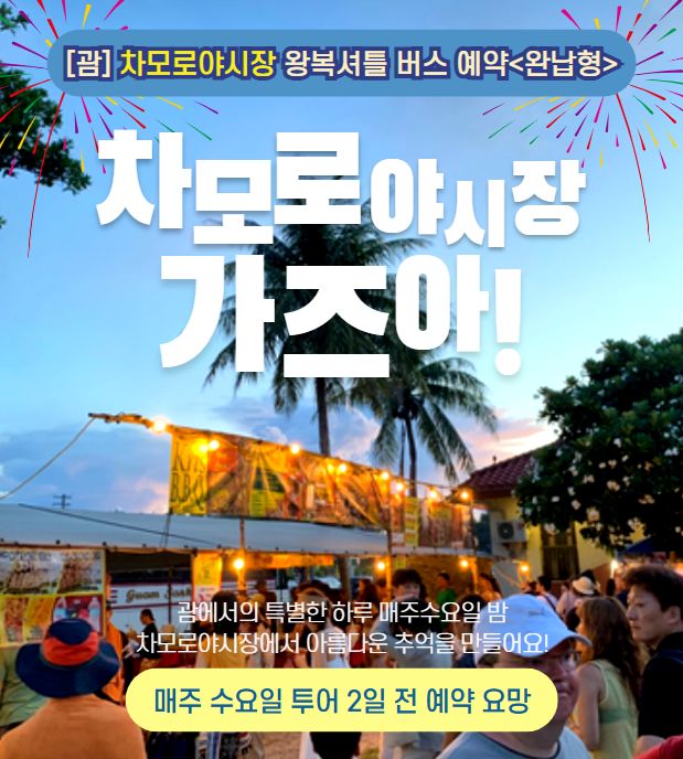 * 다양한 먹거리, 볼거리, 체험이 넘치는 차모로빌리지 야시장을 편리하게 왕복이동