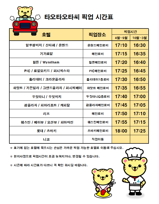 * 픽업 시간이 늦어 픽업 차량을 탑승하지 못한 경우 환불 불가입니다.