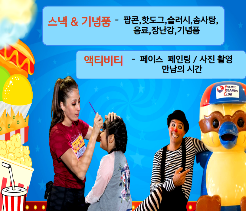 스낵 & 기념품 : 팝콘, 핫도그, 슬러시, 솜사탕, 음료, 장난감, 기념품
